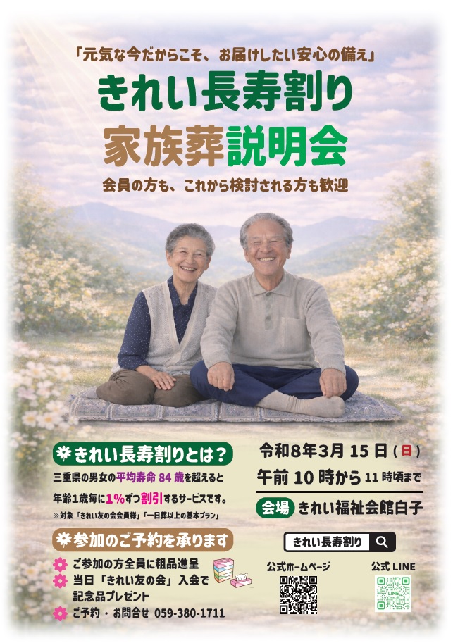3月15日(日)「家族葬・長寿割り説明会」きれい福祉会館白子
